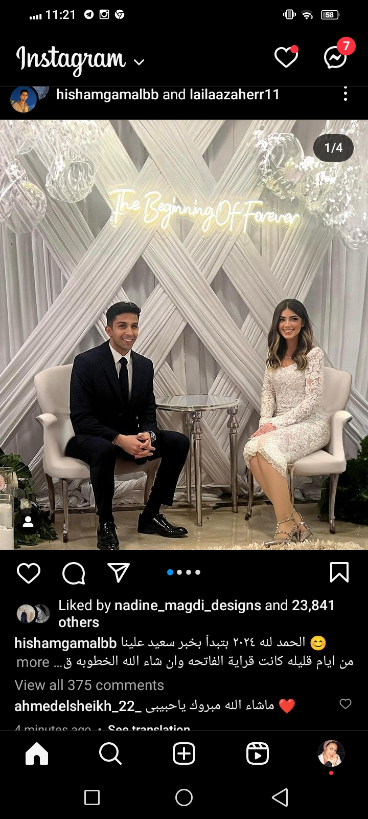 وأعلن الخبر هشام جمال عبر حسابه الرسمي بموقع التواصل الاجتماعى إنستجرام، وكتب:" الحمدلله 2024 بتبدأ بخبر سعيد علينا من أيام قليلة كانت قراية الفاتحة وان شاء الله الخطوبة قريبا نتمنى من كل الناس تدعيلنا بالسعادة والتوفيق والخير"