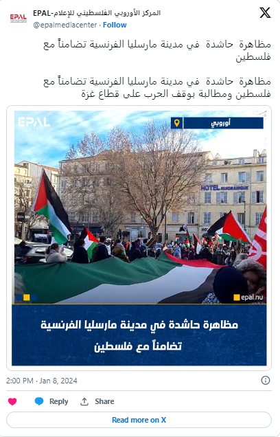 كشف المركز الأوروبي الفلسطيني للإعلام "إيبال" أنه رصد تزايد الزخم الشعبي والحضور الجماهيري الداعم للقضية الفلسطينية في أوروبا في ظل مواصلة الاحتلال الإسرائيلي مجازره في قطاع غزة منذ أكثر من 3 أشهر