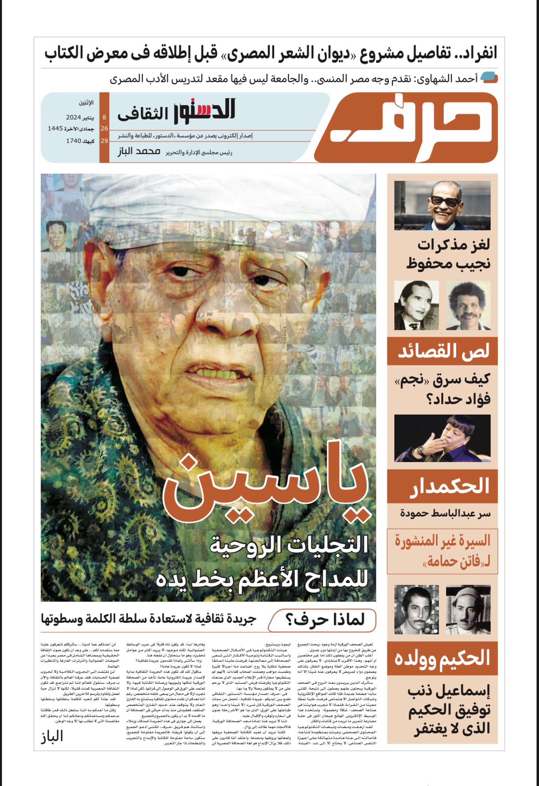 وقال محمد الباز، رئيس مجلسي الإدارة والتحرير، في تقديمه لإصدار "الدستور" الجديد: "فى (حرف) نضع بين أيديكم جريدة ثقافية، تحمل من سمات الصحف الورقة كل شئ، إلا شيئا واحدا وهو طباعتها على الورق، الذى بدأ هو الآخر رحلة جنون فى أسعاره وتوفره والإقبال عليه".