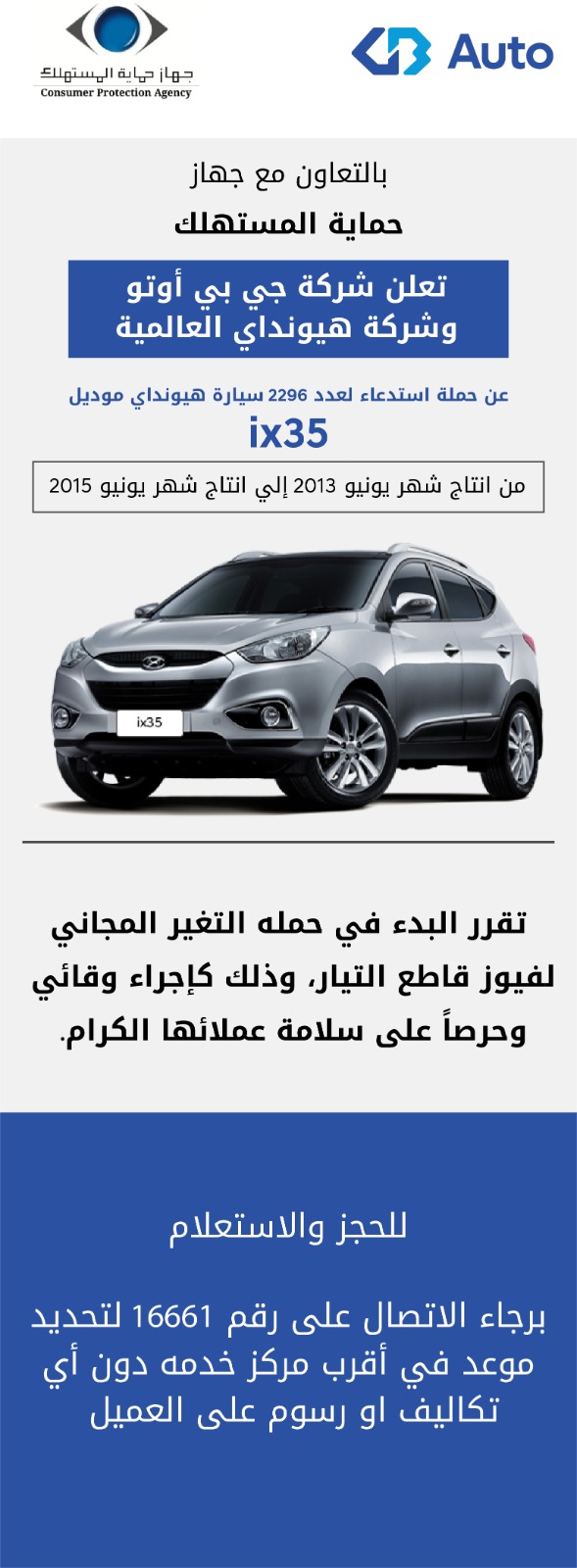 تُعلن شركة جي بي أوتو وشركة هيونداي العالمية عن حملة إستدعاء لعدد 2296 (سيارة هيونداي) موديل (ix 35 ) من إنتاج شهر يونيو 2013 إلي إنتاج شهر يونيو 2015، وذلك للبدء في حملة التغيير المجاني (لفيوز قاطع التيار) وذلك كإجراء وقائي ،ولذا يلزم حضور كافة العملاء لمراكز الصيانة المعتمدة .