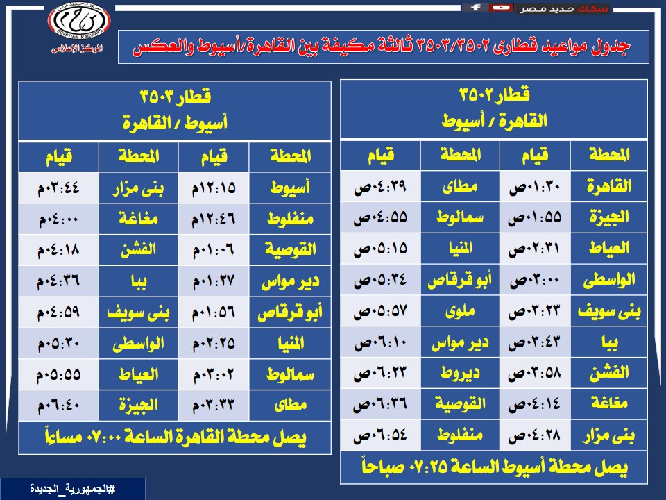 حيث تقرر اعتباراً من يوم السبت الموافق 13 / 1 / 2024 تشغيل قطار 3502 القاهرة / أسيوط بتركيب 8 عربات ثالثة مكيفة يقوم من محطة القاهرة الساعة 01:30 صباحاً ويصل محطة أسيوط الساعة 07:25 صباحاً ، وتشغيل قطار 3503 أسيوط / القاهرة يقوم من محطة أسيوط الساعة 12:15 ظهراً ويصل محطة القاهرة الساعة 07:00 مساءاً بنفس التركيب الوارد به قطار 3502 لمحطة أسيوط طبقاً للجداول المرفقة .