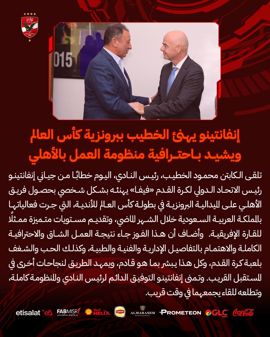تلقى النادي الأهلي، برقية تهنئة من رئيس الاتحاد الدولي لكرة القدم جياني إنفانتينو، هنأ فيها النادي الأهلي برئاسة محمود الخطيب على حصول الفريق على برونزية كأس العالم للأندية، التي أقيمت في المملكة العربية السعودية مطلع ديسمبر الماضي.