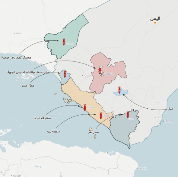 وذكرت قناة "المسيرة" التابعة للحوثيين، أن الضربات طالت "قاعدة الديلمي الجوية الواقعة في جوار مطار العاصمة صنعاء، ومحيط مطار الحديدة، ومناطق في مديرية زبيد، ومعسكر كهلان شرقي مدينة صعدة، ومطار تعز، معسكر اللواء 22 بمديرية التعزية، والمطار في مديرية عبس".