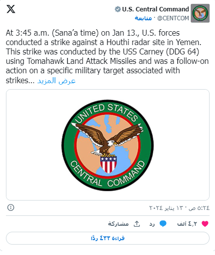 وفي بيان على منصة “إكس”، قالت القيادة المركزية الأمريكية: “نفذت هذه الضربة سفينة يو إس إس كارني (DDG 64) باستخدام صواريخ توماهوك للهجوم البري، وكانت بمثابة إجراء ضد هدف عسكري محدد مرتبط بالضربات التي تم شنها في 12 يناير بغرض إضعاف قدرة الحوثيين على مهاجمة السفن البحرية، بما في ذلك السفن التجارية”.