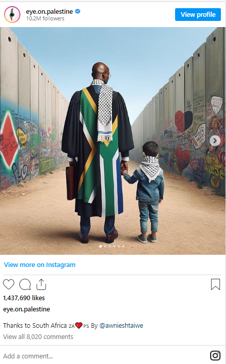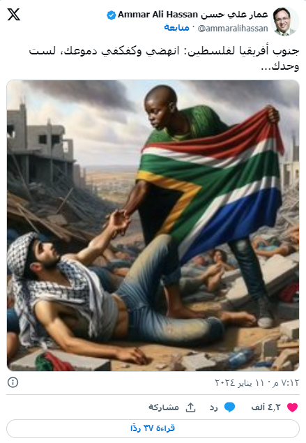 ورأى بعض المغردين على منصة "أكس" أن موقف جنوب أفريقيا ليس رد اعتبار للصوت الفلسطيني فحسب، بل هو تعبير عن تضامن كل شعوب الجنوب العالمي. وتداولوا على نطاق واسع لوحة تظهر شاباً جنوب أفريقي يمد يده لشاب فلسطيني لكي يرفعه عن الأرض.