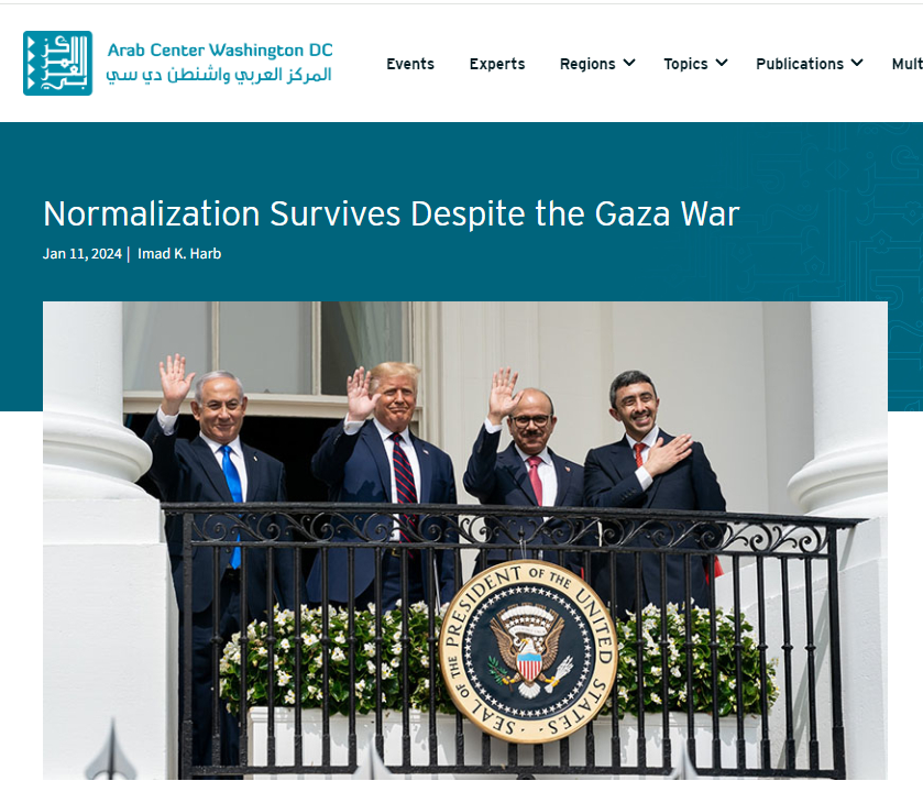 توقع تقرير لـArab Center Washington DC أن ينجو التطبيع بين الدول العربية وإسرائيل من تداعيات حرب غزة، وستعمل هذه الدول على حماية اتفاقات أبراهام، مع مواصلة دعم القضية الفلسطينية.