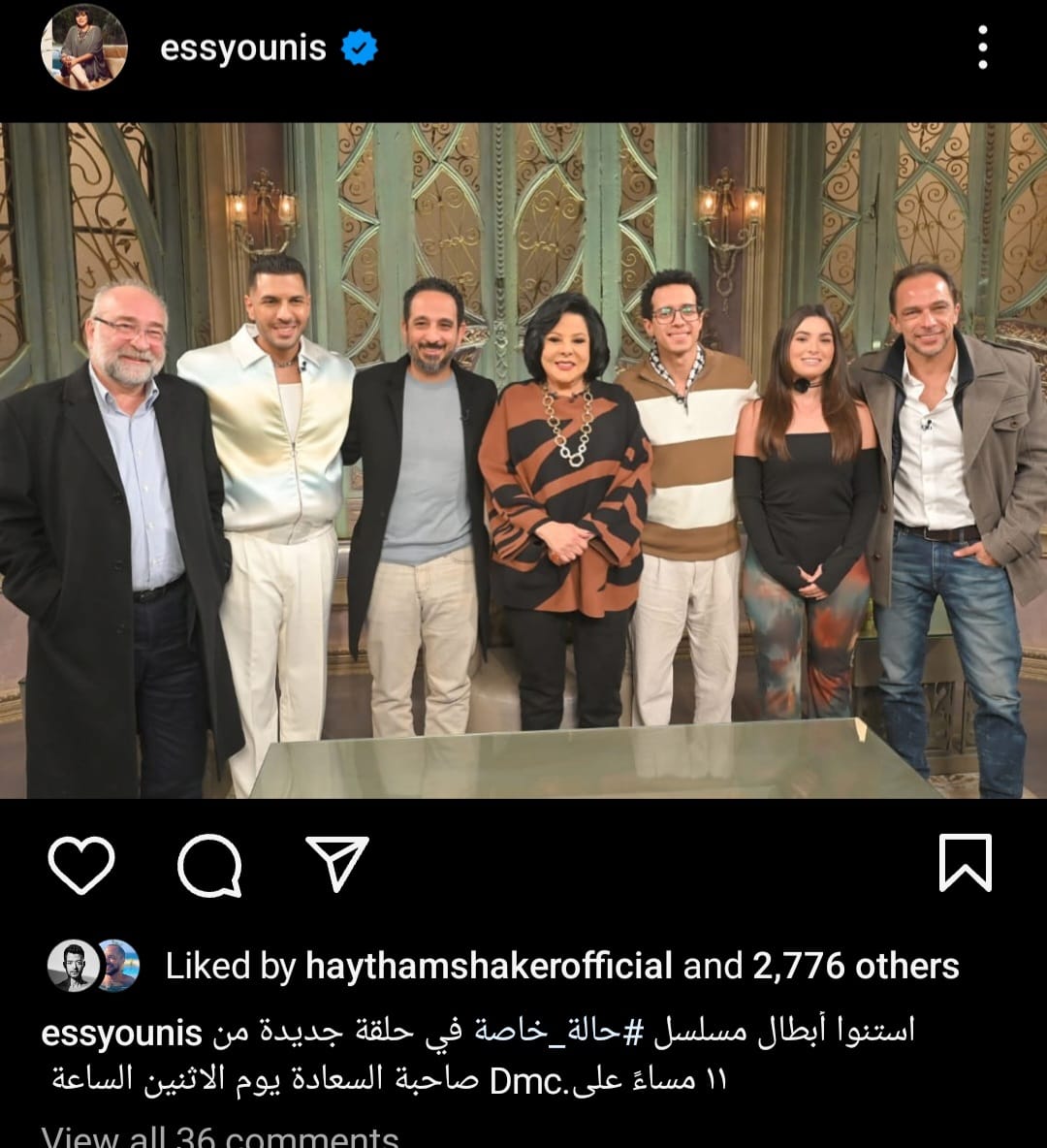 وشوقت"يونس"بصورة لها مع أبطال المسلسل من كواليس تصوير الحلقة، وذلك عبر حسابها الخاص بموقع تبادل الصور والفيديوهات"انستجرام"، وعلقت:"إستنوا أبطال مسلسل"حالة خاصة"في حلقة جديدة من صاحبة السعادة يوم الإثنين الساعة 11 على"dms".