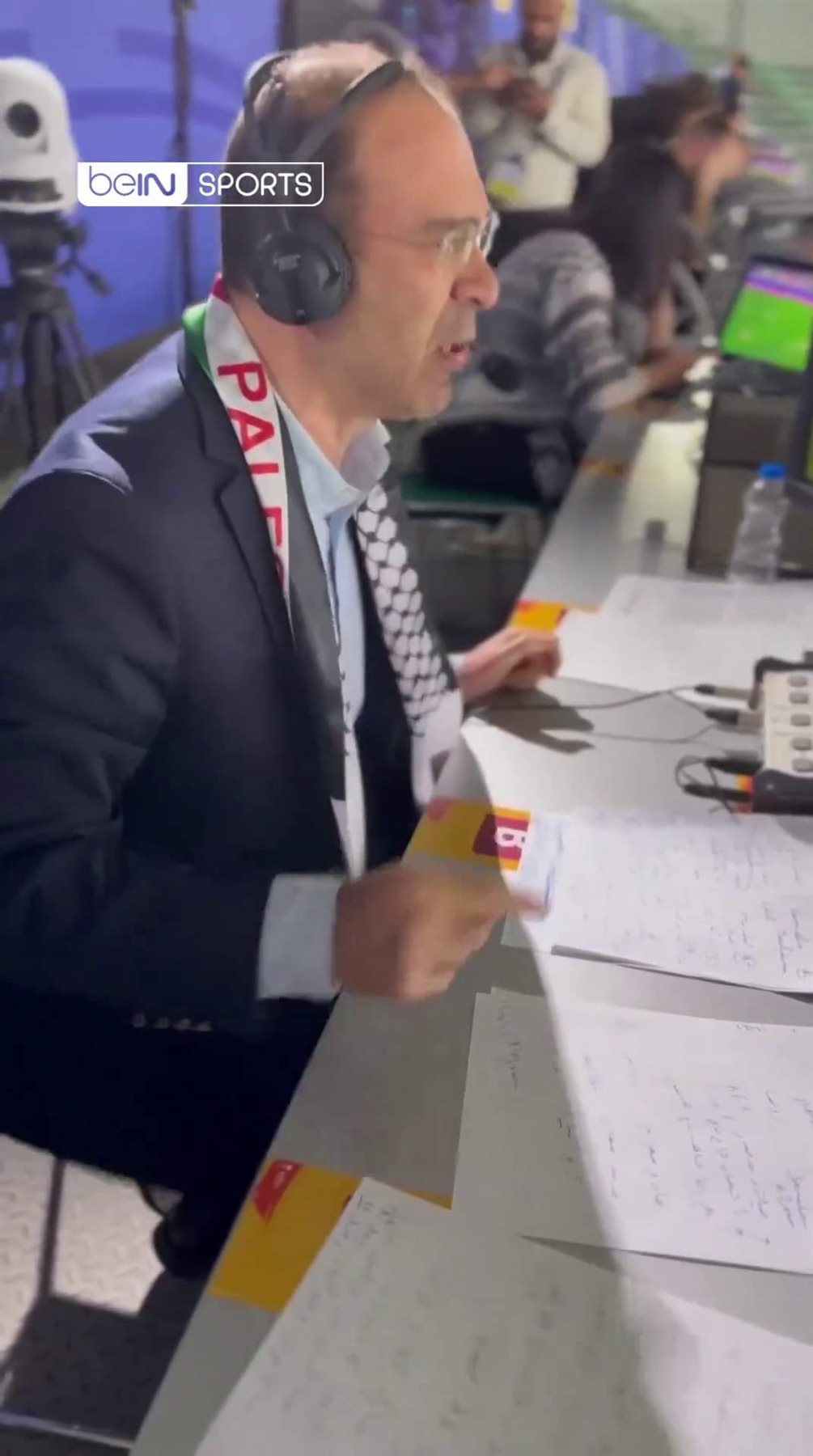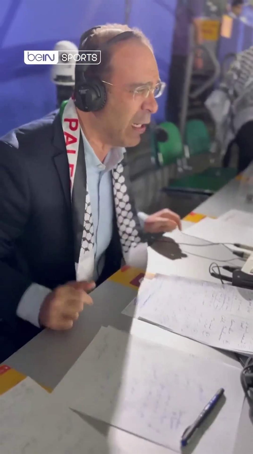 واظهرت اللقطات، المعلق التونسي عصام الشوالي وهو يرتدي الكوفية الفلسطينية أثناء تعليقه على مباراة منتخب فلسطين وإيران، في بطولة كأس آسيا لكرة القدم.