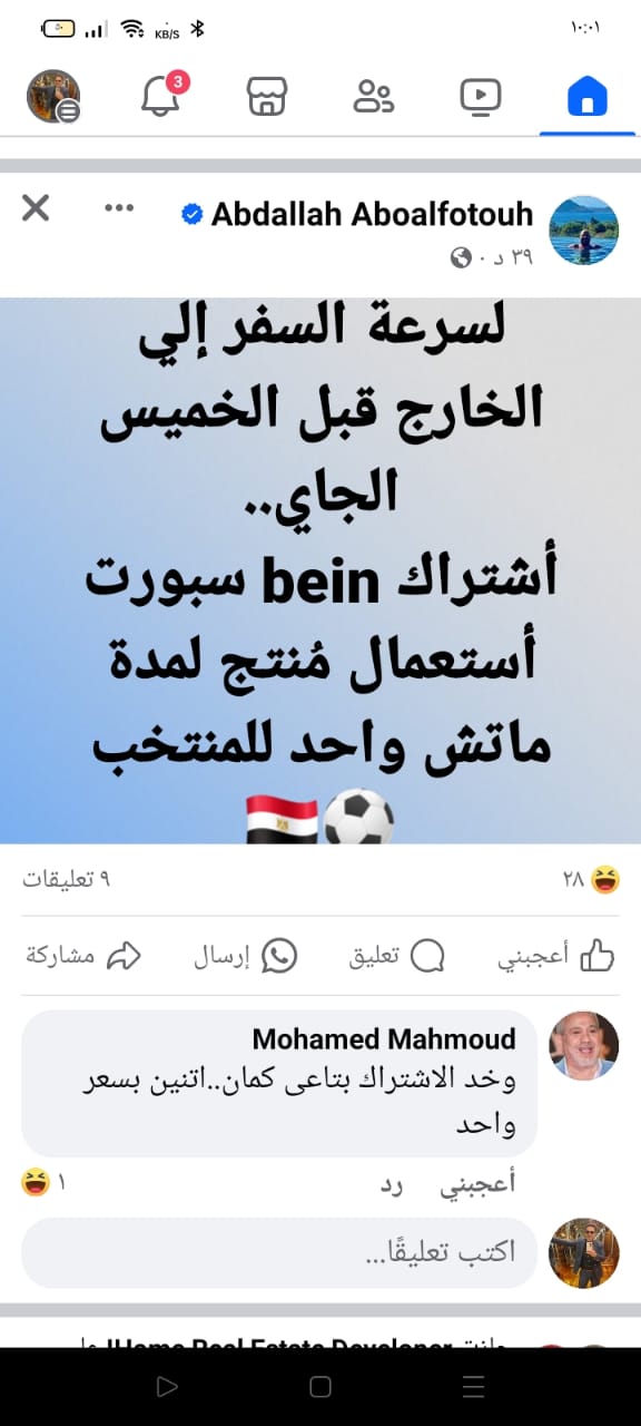 وكتب عبدالله أبو الفتوح عبر حسابه على موقع التواصل الاجتماعي فيسبوك: "لسرعة السفر إلى الخارج قبل الخميس الجاي .. اشتراك بين سبورت استعمال منتج لمدة ماتش واخد للمنتخب".