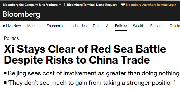 نشرت وكالة Bloomberg الأمريكية تقريراً،اليوم الإثنين ، حول موقف الصين من معركة الملاحة في البحر الأحمر، رغم شنّ الولايات المتحدة وبريطانيا غارات جوية وصاروخية على اليمن، وتقول الدولتان إن الغاية منها منع الحوثيين من مهاجمة السفن.