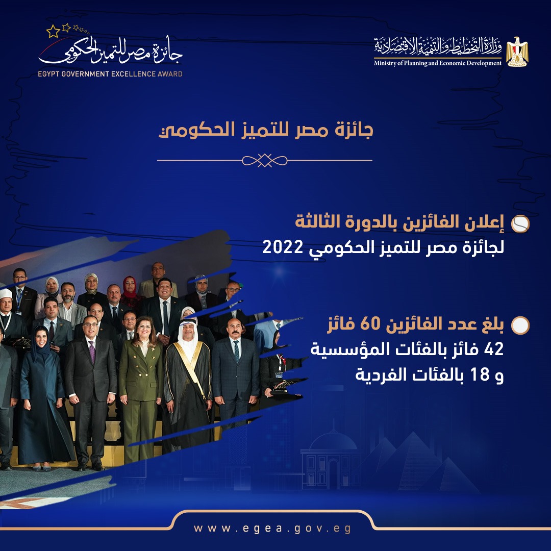 وأشار التقرير إلى أن الربع الأول من العام 2023 شهد إعلان أسماء الفائزين بالدورة الثالثة لجائزة مصر للتميز الحكومي2022 ، خلال فعاليات حفل توزيع جوائز التميز الحكومي ، تحت رعاية السيد الرئيس عبد الفتاح السيسي رئيس الجمهورية، وبحضور وتشريف السيد رئيس مجلس الوزراء الدكتور مصطفي مدبولي، د. هالة السعيد وزيرة التخطيط والتنمية الاقتصادية، ومعالي مريم الحمادي، وزيرة دولة والأمين العام لمجلس الوزراء بالإمارات، وبمشاركة عدد من السادة الوزراء والمحافظين والسفراء وعدد من أعضاء المجالس النيابية، وممثلي دولة الإمارات العربية الشقيقة، حيث بلغ عدد الفائزين 60 فائز ( 42فائز بالفئات المؤسسية و 18 بالفئات الفردية).