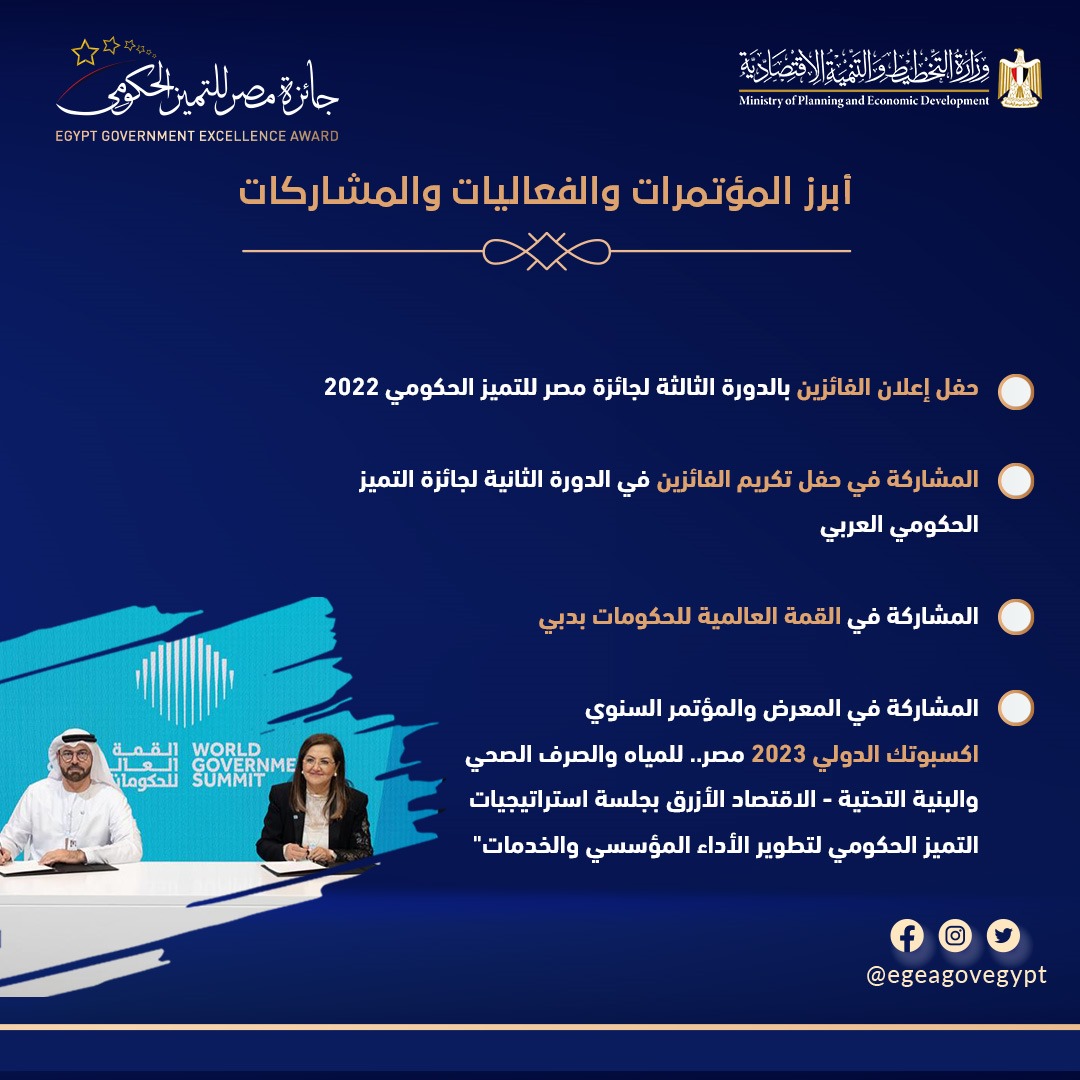 وأضاف التقرير أن جائزة مصر للتميز الحكومي شاركت في عدد من المؤتمرات والفاعليات، منها حفل تكريم الفائزين في الدورة الثانية للجائزة والتي شهدت تكريم 21 فائزا على مستوى الوطن العربي لتحصد مصر 3 جوائز ؛ حيث فازت هيئة قناة السويس بجائزة أفضل هيئة حكومية عربية، ومشروع الخط الثالث لمترو الانفاق عن أفضل مشروع حكومي عربي لتطوير البنية التحتية ، في حين فاز اللواء/ اشرف عبد الباري، محافظ أسوان بجائزة أفضل محافظ عربي، إضافة الى المشاركة في القمة العالمية للحكومات بدبي، وكذلك بجلسة "استراتيجيات التميز الحكومي لتطوير الأداء المؤسسي والخدمات" على هامش فعاليات المعرض والمؤتمر السنوي اكسبوتك الدولي 2023 "مصر.. للمياه والصرف الصحي والبنية التحتية- الاقتصاد الأزرق" .