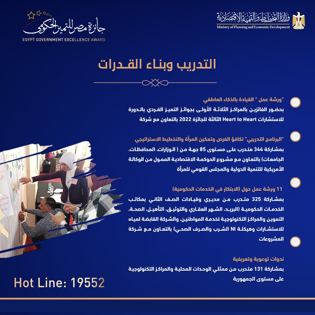 و عقدت إدارة الجائزة عدة ورش عمل وبرامج تدريبية للجهات المختلفة، ومنها ورشة عمل " القيادة بالذكاء العاطفي" والتي تم تقديمها لعدد 15 متدرب من الفائزين بالمراكز الثلاثة الأولى بجوائز التميز الفردي بالدورة الثالثة للجائزة 2022 بالتعاون مع شركة Heart to Heart للاستشارات، والبرنامج التدريبي" تكافؤ الفرص وتمكين المرأة والتخطيط الاستراتيجي" بمشاركة 344 متدرب على مستوى 85 جهة من ( الوزارات، المحافظات، الجامعات) بالتعاون مع مشروع الحوكمة الاقتصادية الممول من الوكالة الأمريكية للتنمية الدولية والمجلس القومي للمرأة، بالإضافة إلى عقد 11 ورشة عمل حول ( الابتكار الخدمات الحكومية) بمشاركة 325 متدرب من مديري وقيادات الصف الثاني مكاتب الخدمات الحكومية، لتشمل (البريد، الشهر العقاري والتوثيق، التأهيل، الصحة، التموين والمراكز التكنولوجية لخدمة المواطنين، والشركة القابضة لمياه الشرب والصرف الصحي) بهدف بناء الجاهزية للابتكار الحكومي في تقديم الخدمات الحكومية والتعرف على المبادئ الأساسية للتفكير التصميمي وبالتعاون مع شركة NI للاستشارات وهيكلة المشروعات، وعقد ندوات توعوية وتعريفية بمشاركة 131 متدرب من ممثلي الوحدات المحلية و المراكز التكنولوجية على مستوى الجمهورية.
