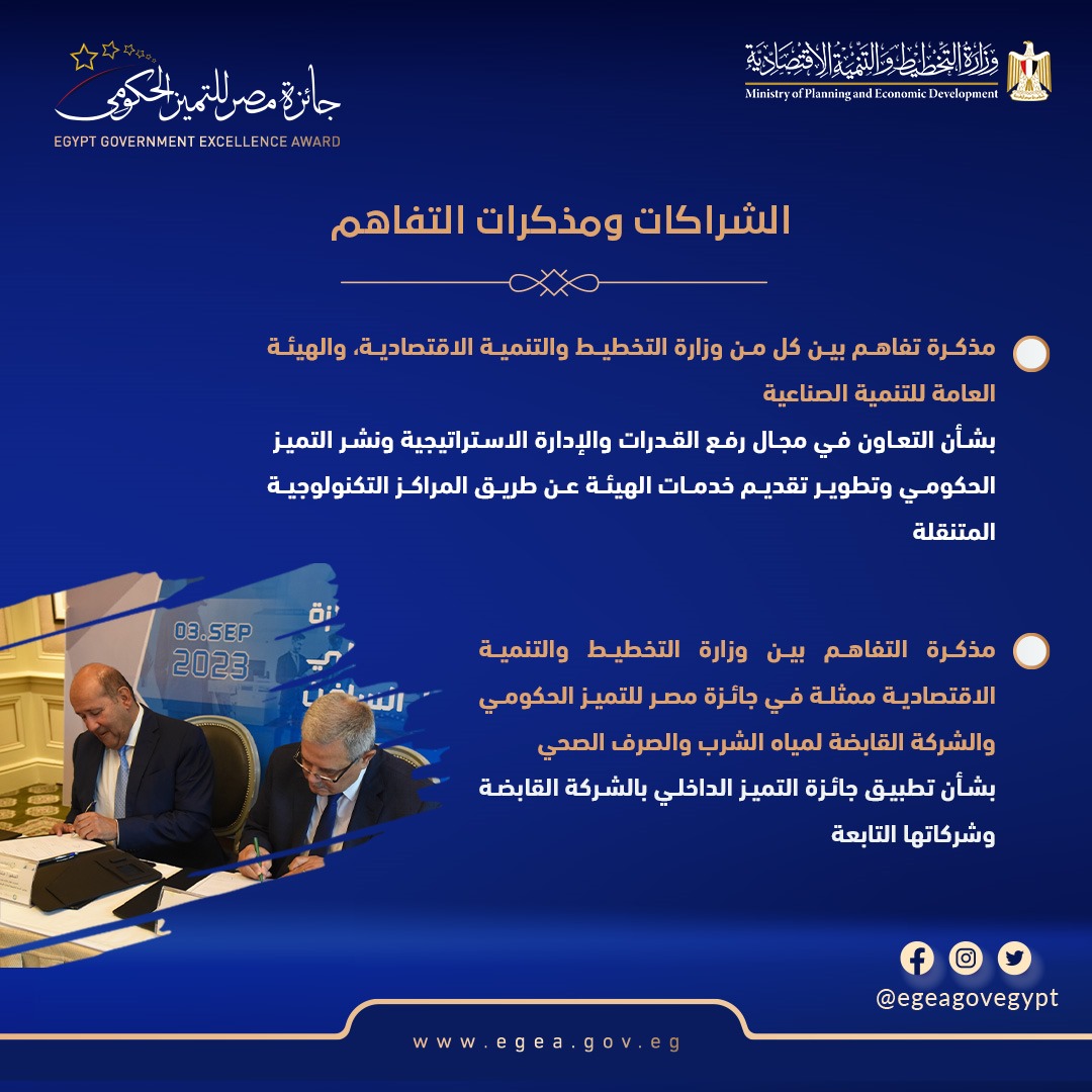 وفيما يتعلق بالشراكات ومذكرات التفاهم، فقد تم خلال 2023 توقيع مذكرة تفاهم بين كل من وزارة التخطيط والتنمية الاقتصادية، والهيئة العامة للتنمية الصناعية، بشأن التعاون في مجال رفع القدرات والإدارة الاستراتيجية ونشر التميز الحكومي وتطوير تقديم خدمات الهيئة عن طريق المراكز التكنولوجية المتنقلة، كما تم توقيع مذكرة تفاهم بين وزارة التخطيط والتنمية الاقتصادية ممثلة في جائزة مصر للتميز الحكومي والشركة القابضة لمياه الشرب والصرف الصحي بشأن تطبيق جائزة التميز الداخلي بالشركة القابضة وشركاتها التابعة.