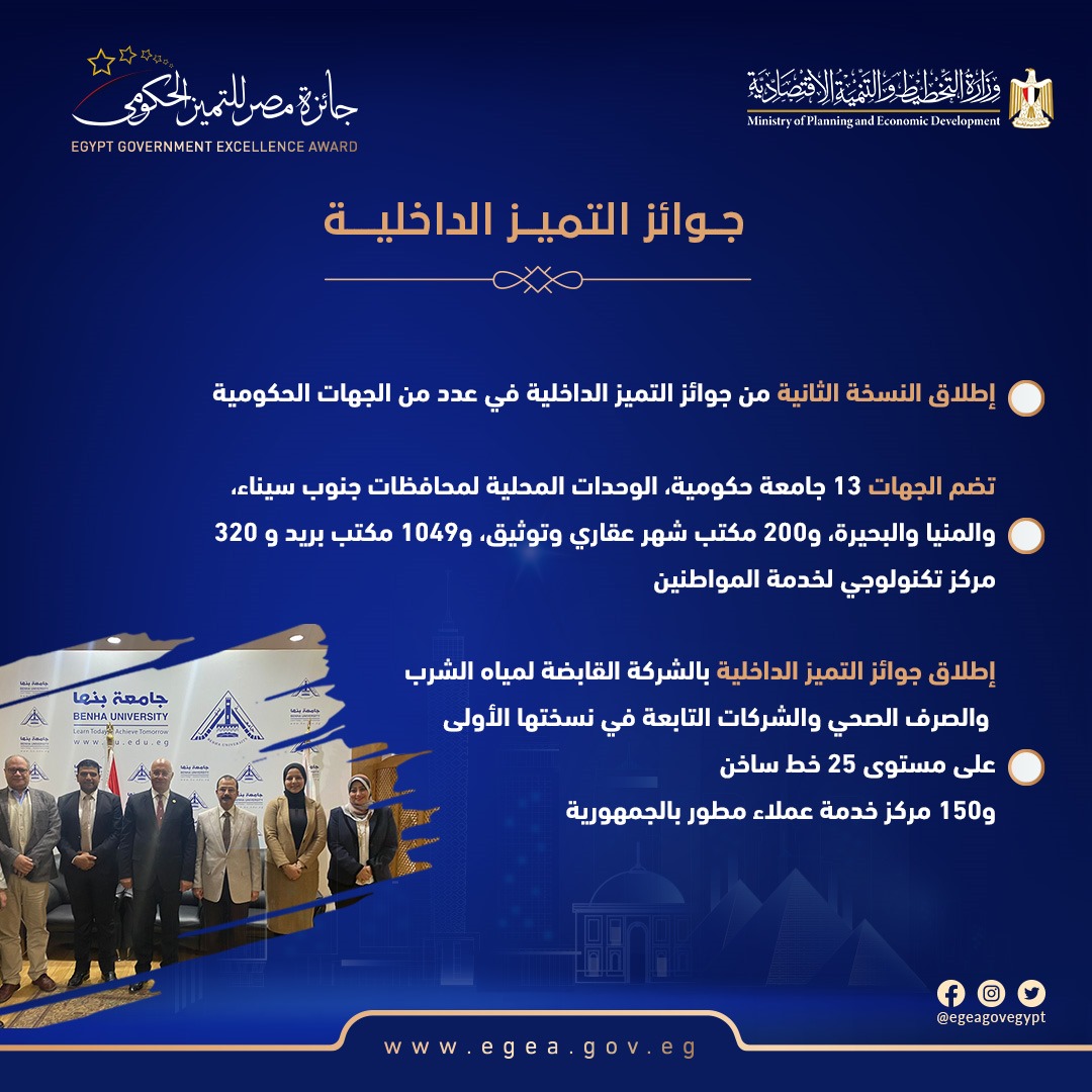 وحول جوائز التميز الداخلية، أوضح التقرير أنه تم إطلاق النسخة الثانية لها في عدد من الجهات الحكومية وذلك بهدف تنمية القدرات البشرية وإحداث نقلة نوعية في الأداء المؤسسي، والعمل على تأهيل الجهات للمشاركة في الجائزة الوطنية "جائزة مصر للتميز الحكومي" لتضم عدد 13 جامعه من إجمالي 27 جامعة مصرية حكومية، الوحدات المحلية لعدد 3 محافظات (جنوب سيناء، المنيا والبحيرة)، وعن الوحدات الخدمية شهدت مشاركة 200 مكتب شهر عقاري وتوثيق، 1049 مكتب بريد و 320 مركز تكنولوجي لخدمة المواطنين إضافة الى اطلاق جوائز التميز الداخلية بالشركة القابضة لمياه الشرب والصرف الصحي والشركات التابعة في نسختها الأولى على مستوى 25 خط ساخن و 150 مركز خدمة عملاء مطور بالجمهورية وفى مبادرة الاولي من نوعها كأول قطاع حكومي خدمي.