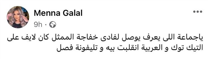 كتبت منة جلال على حسابها على موقع التواصل الاجتماعي “فيسبوك” قائلة:"يا جماعة اللي يعرف يوصل لفادي خفاجة الممثل كان لايف على التيك توك والعربية اتقلبت بيه وتليفونه فصل.
