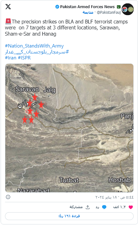ونشر الحساب الرسمي للجيش الباكستاني على منصة “إكس” تدوينة تضمنت مواقع الأهداف التي قصفتها داخل إيران، وقال: “تم توجيه ضربات دقيقة على معسكرات تنظيمات BLA” وBLF الإرهابية، استهدفت 7 مواقع في 3 مناطق مختلفة”.
