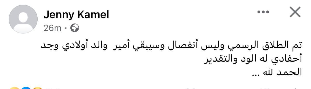 وقالت جيني عبر "فيس بوك": تم الطلاق الرسمي وليس أنفصال وسيبقي أمير طعيمة والد أولادي وجد أحفادي له الود والتقدير، الحمد لله".