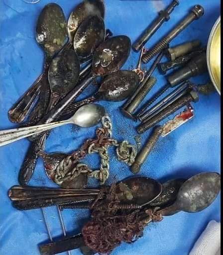 وعلي الفور تم عمل منظار للمريض أظهر وجود أجسام معدنية غريبة بالمعده عبارة عن ملاعق شاى وسلاسل معدنية وعدد من المسامير العادية ومسامير بورمة وموس حلاقة و 2 بوجيه سيارة، تسببت فى التهابات مزمنة فى جدار المعدة.
