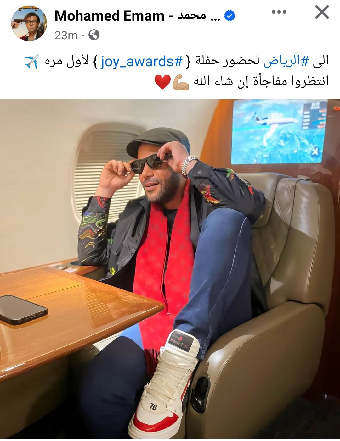 علق عليها قائلًا: “إلى الرياض لحضور حفلة Joy awards لأول مرة.. انتظروا مفاجأة إن شاء الله”، وقد حاز المنشور على إعجاب عدد كبير من الجمهور والمتابعين".