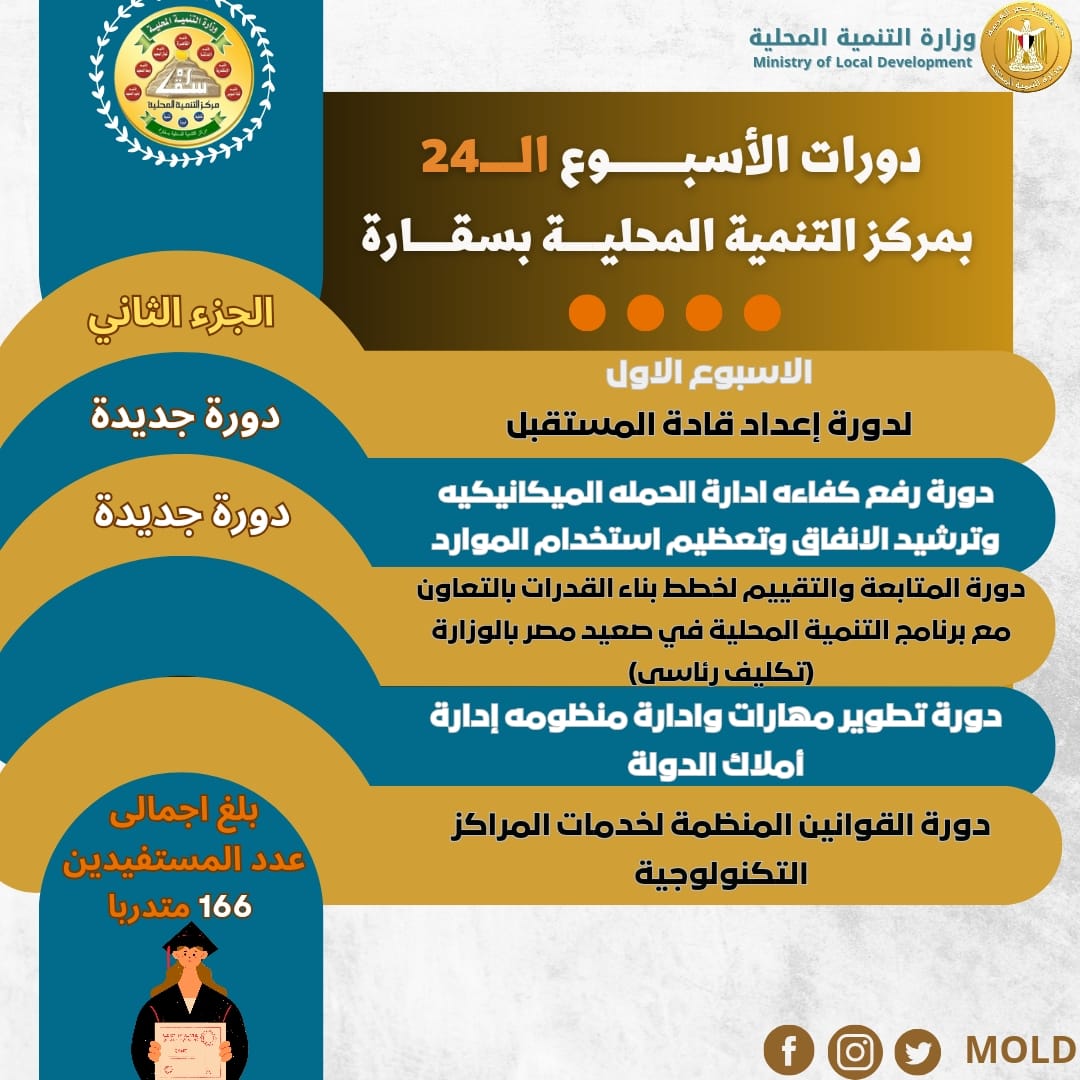 أعلن اللواء هشام آمنة وزير التنمية المحلية، بدء الجزء الثاني من دورة إعداد قادة المستقبل غداً الاحد 21-1-2024 في الأسبوع التدريبي الـ24 من الخطة التدريبية للمحليات للعام المالي الحالي بمركز التنمية المحلية بسقارة ، وتستمر لمدة 3 أسابيع بإجمالي 102 ساعة تدريب ، ويستفيد منها 55 متدرباً من ديوان عام الوزارة وجميع المحافظات، مشيراً إلى ان هذه الدورة الهامة تهدف لخلق كوادر قيادية وشبابية مدربة ومؤهلة للتعامل بكافة الأساليب الحديثة باعتبارهم قادة المستقبل وأساس تقدم الدولة.
