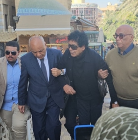 انهار الفنان محمد منير، من البكاء أول وصوله مسجد الحصري، لتشييع جثمان شقيقته سميحة أبا زيد.