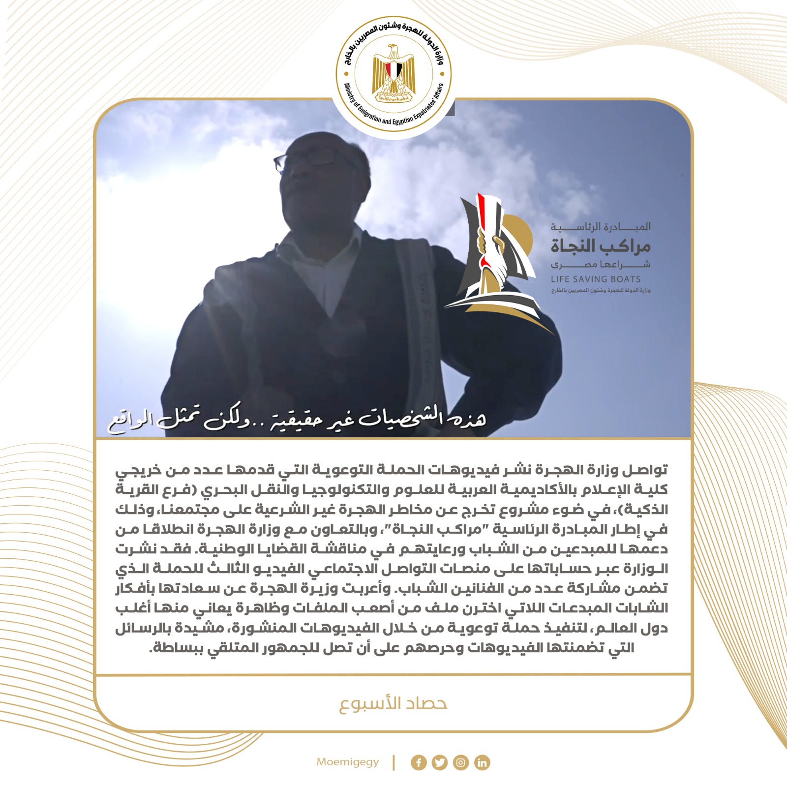 9- تواصل وزارة الهجرة نشر فيديوهات الحملة التوعوية التي قدمها عدد من خريجي كلية الإعلام بالأكاديمية العربية للعلوم والتكنولوجيا والنقل البحري (فرع القرية الذكية)، في ضوء مشروع تخرج عن مخاطر الهجرة غير الشرعية على مجتمعنا، وذلك في إطار المبادرة الرئاسية "مراكب النجاة"، وبالتعاون مع وزارة الهجرة انطلاقا من دعمها للمبدعين من الشباب ورعايتهم في مناقشة القضايا الوطنية. فقد نشرت الوزارة عبر حساباتها على منصات التواصل الاجتماعي الفيديو الثالث للحملة الذي تضمن مشاركة عدد من الفنانين الشباب. وأعربت وزيرة الهجرة عن سعادتها بأفكار الشابات المبدعات اللاتي اخترن ملف من أصعب الملفات وظاهرة يعاني منها أغلب دول العالم، لتنفيذ حملة توعوية من خلال الفيديوهات المنشورة، مشيدة بالرسائل التي تضمنتها الفيديوهات وحرصهم على أن تصل للجمهور المتلقي ببساطة.