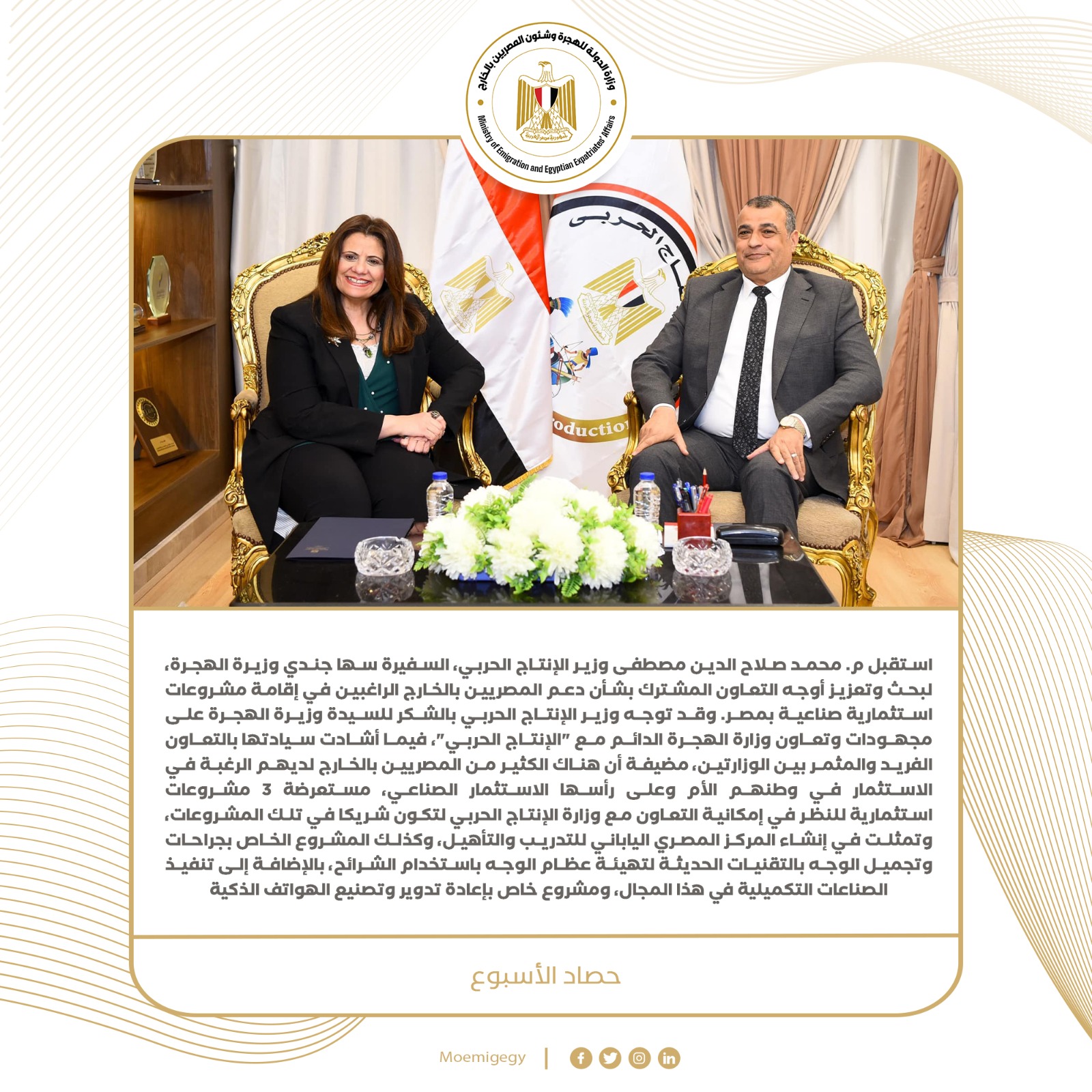 2- استقبل م. محمد صلاح الدين مصطفى وزير الإنتاج الحربي، السفيرة سها جندي وزيرة الهجرة، لبحث وتعزيز أوجه التعاون المشترك بشأن دعم المصريين بالخارج الراغبين في إقامة مشروعات استثمارية صناعية بمصر. وقد توجه وزير الإنتاج الحربي بالشكر للسيدة وزيرة الهجرة على مجهودات وتعاون وزارة الهجرة الدائم مع "الإنتاج الحربي"، فيما أشادت سيادتها بالتعاون الفريد والمثمر بين الوزارتين، مضيفة أن هناك الكثير من المصريين بالخارج لديهم الرغبة في الاستثمار في وطنهم الأم وعلى رأسها الاستثمار الصناعي، مستعرضة 3 مشروعات استثمارية للنظر في إمكانية التعاون مع وزارة الإنتاج الحربي لتكون شريكا في تلك المشروعات، وتمثلت في إنشاء المركز المصري الياباني للتدريب والتأهيل، وكذلك المشروع الخاص بجراحات وتجميل الوجه بالتقنيات الحديثة لتهيئة عظام الوجه باستخدام الشرائح، بالإضافة إلى تنفيذ الصناعات التكميلية في هذا المجال، ومشروع خاص بإعادة تدوير وتصنيع الهواتف الذكية.