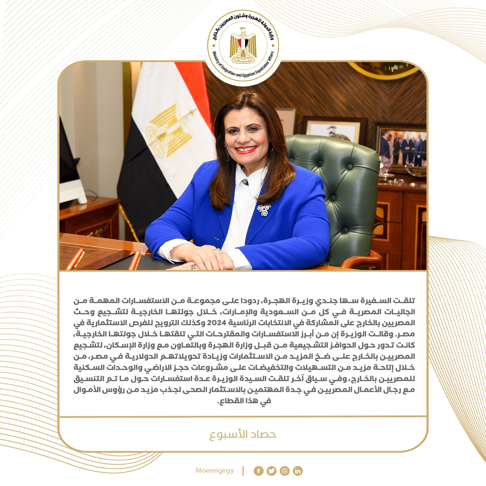 4- تلقت السفيرة سها جندي وزيرة الهجرة، ردودا على مجموعة من الاستفسارات المهمة من الجاليات المصرية في كل من السعودية والإمارات، خلال جولتها الخارجية لتشجيع وحث المصريين بالخارج على المشاركة في الانتخابات الرئاسية 2024 وكذلك الترويج للفرص الاستثمارية في مصر. وقالت الوزيرة إن من أبرز الاستفسارات والمقترحات التي تلقتها خلال جولتها الخارجية، كانت تدور حول الحوافز التشجيعية مـن قبـل وزارة الهجرة وبالتعاون مع وزارة الإسكان، لتشجيع المصريين بالخارج علـى ضـخ المزيد من الاستثمارات وزيادة تحويلاتهم الدولارية في مصر، من خلال إتاحة مزيد من التسهيلات والتخفيضات على مشروعات حجز الاراضي والوحدات السكنية للمصريين بالخارج، وفي سياق آخر تلقت السيدة الوزيرة عدة استفسارات حول ما تم التنسيق مع رجال الأعمال المصريين في جدة المهتمين بالاستثمار الصحى لجذب مزيد من رؤوس الأموال في هذا القطاع.