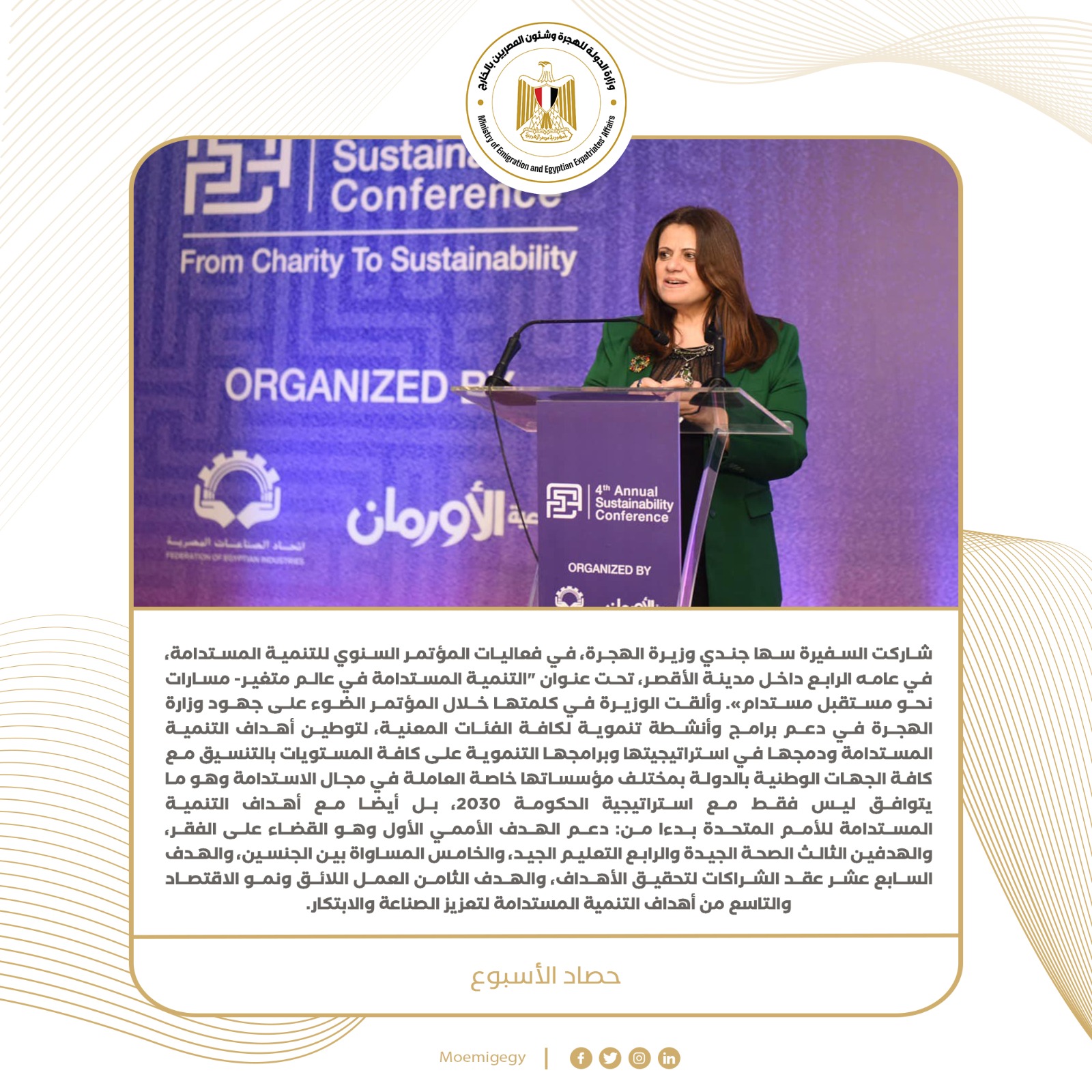 شاركت السفيرة سها جندي وزيرة الهجرة، في فعاليات المؤتمر السنوي للتنمية المستدامة، في عامه الرابع داخل مدينة الأقصر، تحت عنوان "التنمية المستدامة في عالم متغير- مسارات نحو مستقبل مستدام». وألقت الوزيرة في كلمتها خلال المؤتمر الضوء على جهود وزارة الهجرة في دعم برامج وأنشطة تنموية لكافة الفئات المعنية، لتوطين أهداف التنمية المستدامة ودمجها في استراتيجيتها وبرامجها التنموية على كافة المستويات بالتنسيق مع كافة الجهات الوطنية بالدولة بمختلف مؤسساتها خاصة العاملة في مجال الاستدامة وهو ما يتوافق ليس فقط مع استراتيجية الحكومة 2030، بل أيضا مع أهداف التنمية المستدامة للأمم المتحدة بدءا من: دعم الهدف الأممي الأول وهو القضاء على الفقر، والهدفين الثالث الصحة الجيدة والرابع التعليم الجيد، والخامس المساواة بين الجنسين، والهدف السابع عشر عقد الشراكات لتحقيق الأهداف، والهدف الثامن العمل اللائق ونمو الاقتصاد والتاسع من أهداف التنمية المستدامة لتعزيز الصناعة والابتكار.