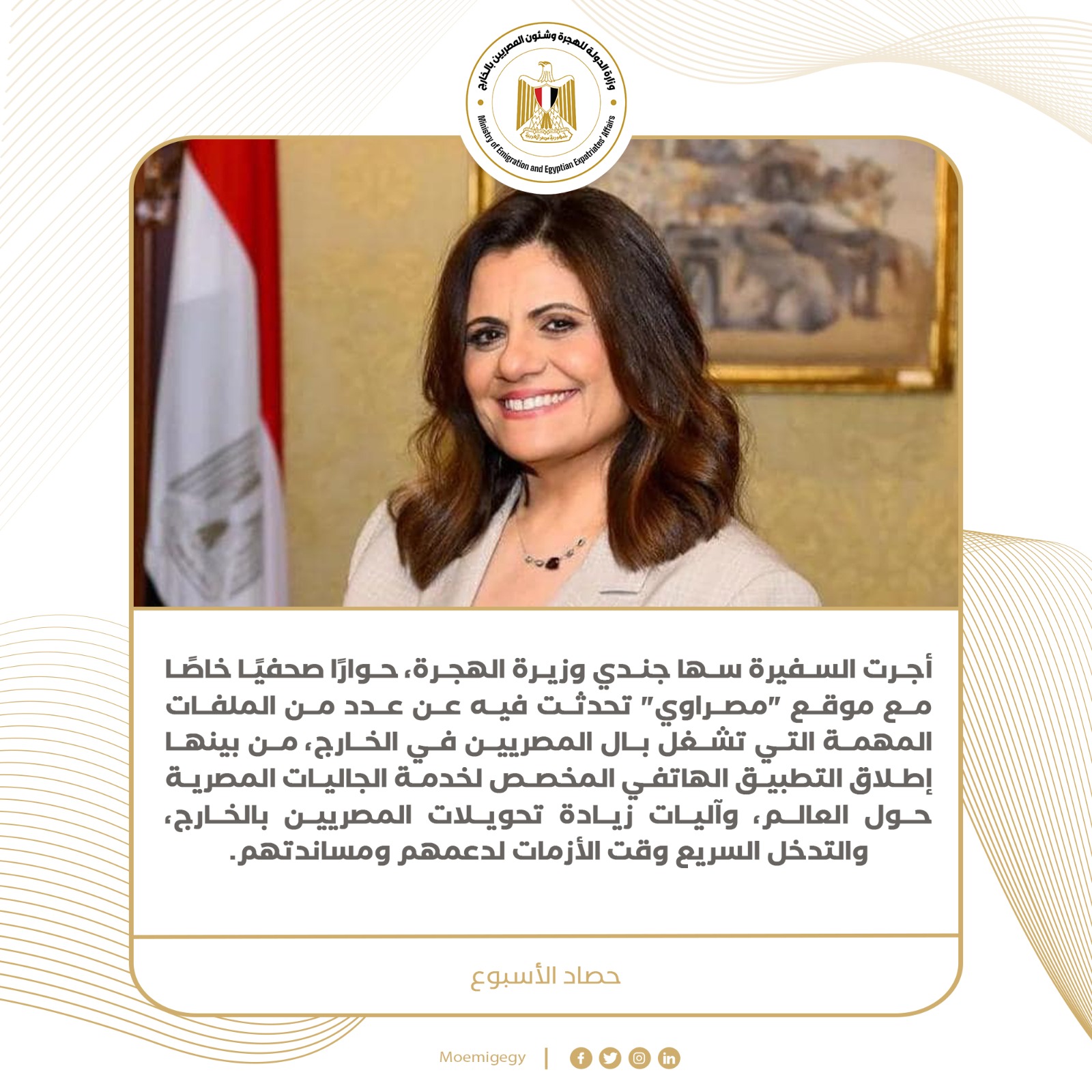 8- أجرت السفيرة سها جندي وزيرة الهجرة، حوارًا صحفيًا خاصًا مع موقع "مصراوي" تحدثت فيه عن عدد من الملفات المهمة التي تشغل بال المصريين في الخارج، من بينها إطلاق التطبيق الهاتفي المخصص لخدمة الجاليات المصرية حول العالم، وآليات زيادة تحويلات المصريين بالخارج، والتدخل السريع وقت الأزمات لدعمهم ومساندتهم.