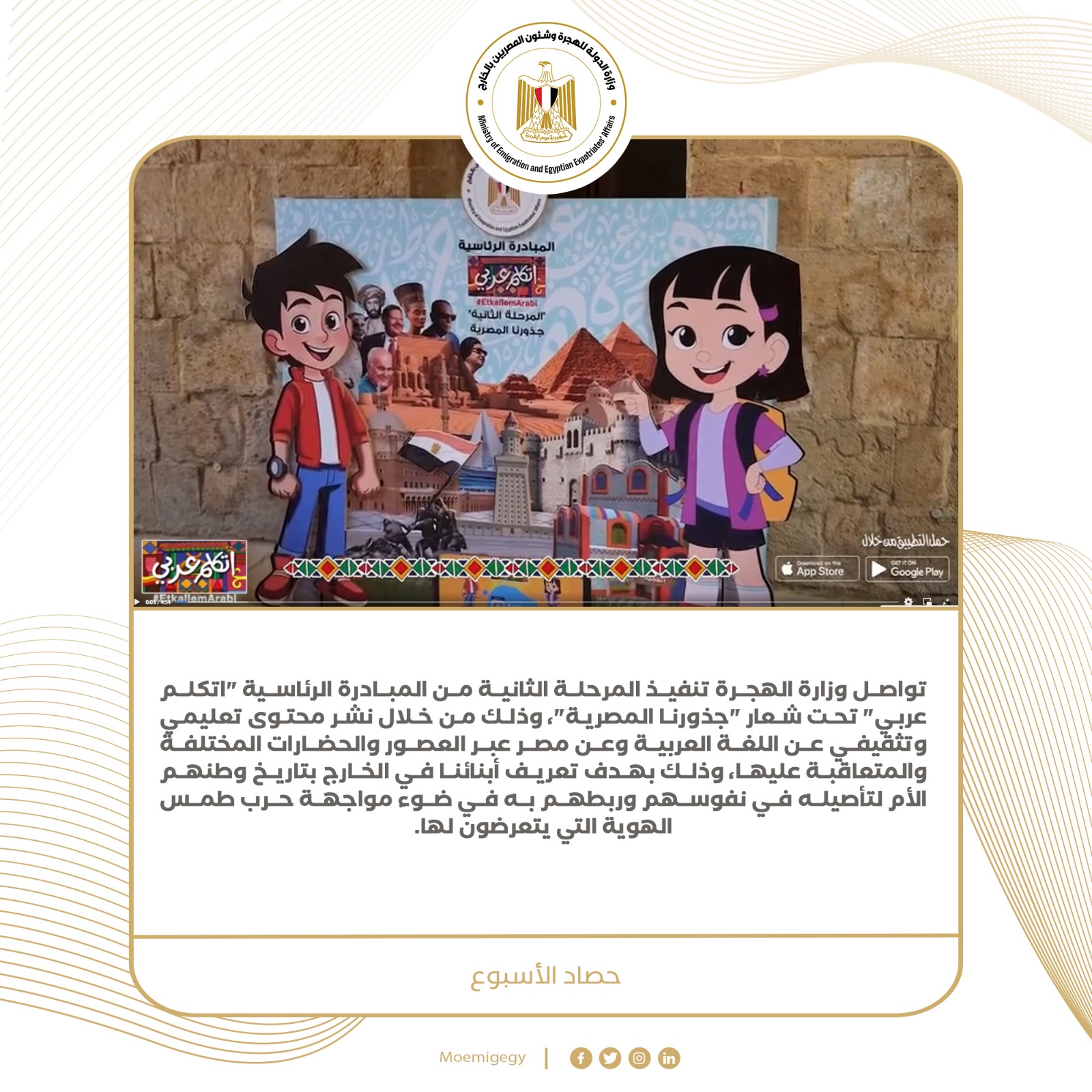 11- تواصل وزارة الهجرة تنفيذ المرحلة الثانية من المبادرة الرئاسية "اتكلم عربي" تحت شعار "جذورنا المصرية"، وذلك من خلال نشر محتوى تعليمي وتثقيفي عن اللغة العربية وعن مصر عبر العصور والحضارات المختلفة والمتعاقبة عليها، وذلك بهدف تعريف أبنائنا في الخارج بتاريخ وطنهم الأم لتأصيله في نفوسهم وربطهم به في ضوء مواجهة حرب طمس الهوية التي يتعرضون لها.