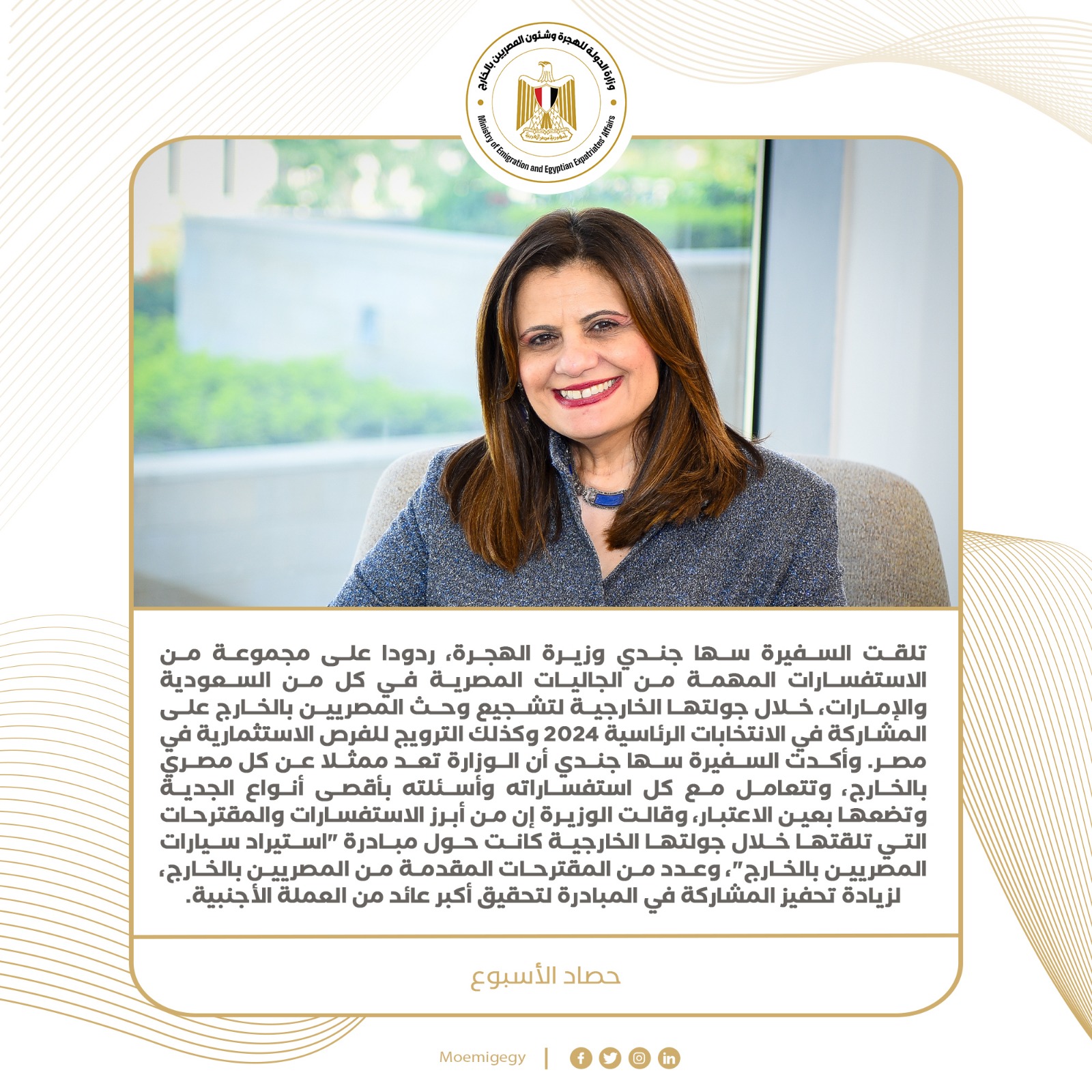 7- تلقت السفيرة سها جندي وزيرة الهجرة، ردودا على مجموعة من الاستفسارات والأسئلة الهامة من الجاليات المصرية في السعودية والإمارات، والتي تلقتها ضمن جولتها الخارجية لتشجيع وحث المصريين بالخارج على المشاركة في الانتخابات الرئاسية 2024، وكذلك الترويج للفرص الاستثمارية في مصر. وقالت الوزيرة إن من أبرز الاستفسارات والمقترحات التي تلقتها خلال جولتها الخارجية كانت تدور حول الحوافز التشجيعية مـن قبـل وزارة الهجرة وبالتعاون مع وزارة الإسكان، لتشجيع المصريين بالخارج علـى ضـخ المزيد من الإستثمارات وزيادة تحويلاتهم الدولارية في مصر، من خلال إتاحة مزيد من التسهيلات والتخفيضات على مشروعات حجز الأراضي والوحدات السكنية للمصريين بالخارج.