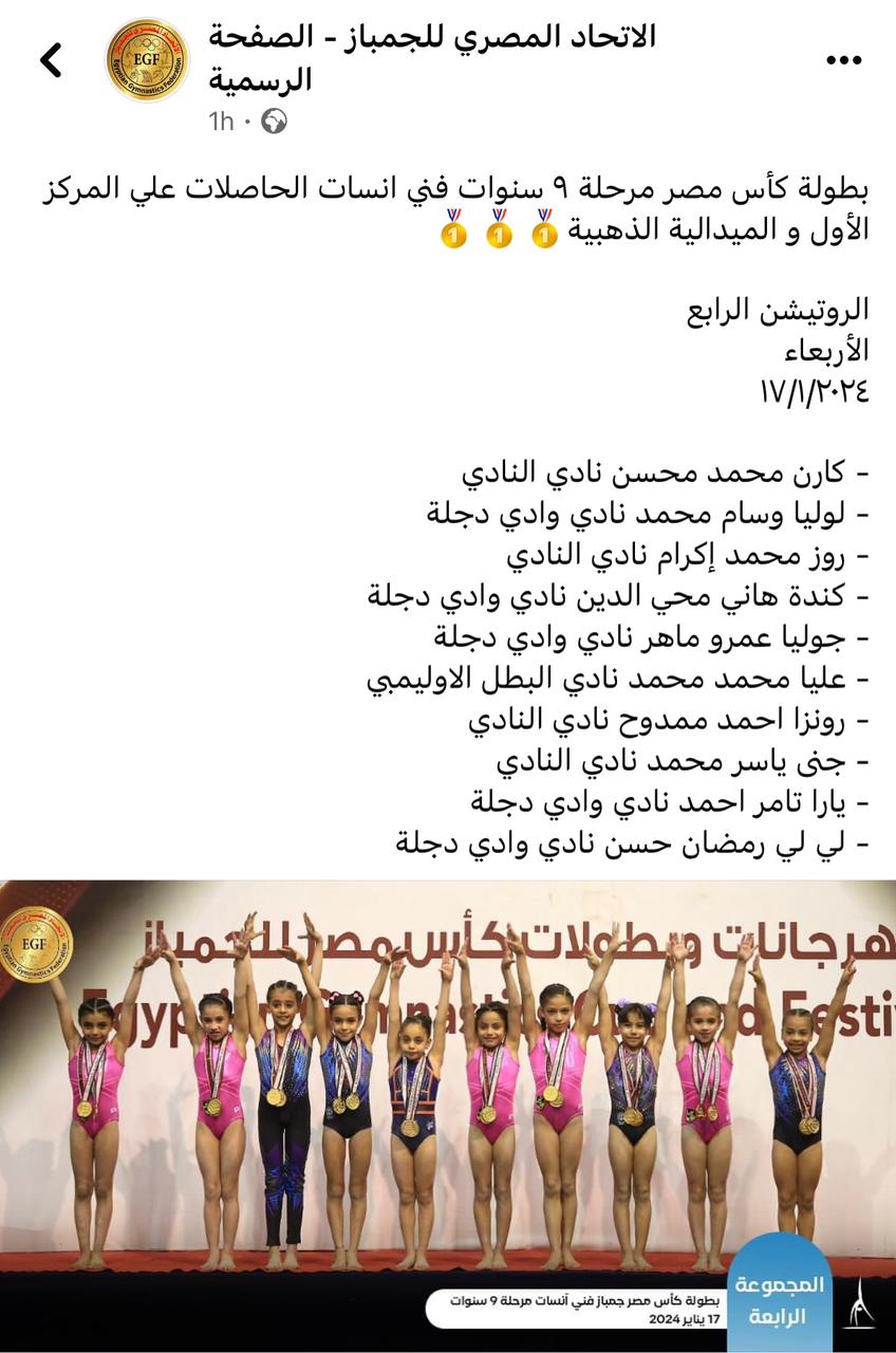 حصلت اللاعبة رونزا احمد ممدوح مرحلة ٩ سنوات علي ٢ ذهبية السابع فردي عام و الاول حصان القفز ببطولة كأس مصر للجمباز والتي أقيمت بالصالة المغطاة باستاد القاهرة.