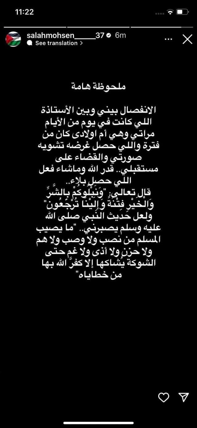 أعلن صلاح محسن لاعب النادي الأهلي على صفحته على موقع التواصل الإجتماعي إنستجرام إنفاصله عن زوجته، بعد أزمة صور وفيدويهات المعجبات ، والتي شاركتها زوجته على السوشيال ميديا، وسط اتهامه بالخيانة الزوجية لها.