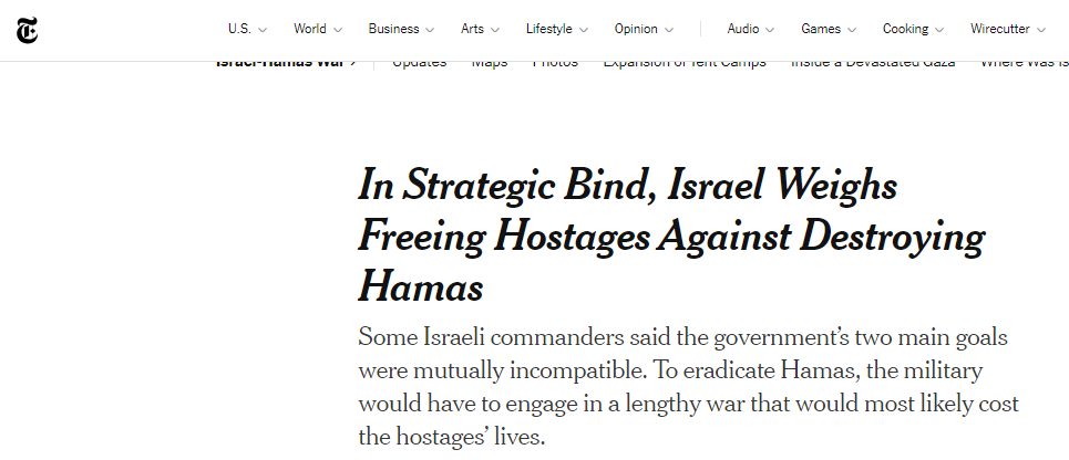 إن الهدفين المزدوجين المتمثلين في تحرير الأسرى وتدمير حماس أصبحا الآن غير متوافقَين، وفقاً لمقابلات أجرتها صحيفة New York Times الأمريكية مع أربعة من كبار القادة العسكريين، الذين تحدثوا بشرط عدم الكشف عن هوياتهم، لأنه لم يُسمح لهم بالتحدث علناً عن آرائهم الشخصية.