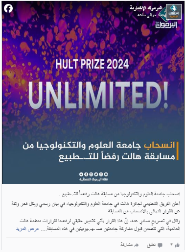 كما أعلن الفريق التنظيمي لـ"مسابقة هالت" بجامعة العلوم والتكنولوجيا الأردنية، في بيان، الانسحاب من المسابقة. وقال إنّ هذا القرار "يأتي كتعبير حقيقي لرفضنا لقرارات منظمة هالت العالمية، التي تتضمن قبول مشاركة جامعتين صهيونيتين في هذه المسابقة".