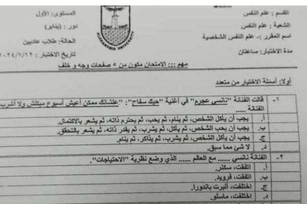 وتضمن الامتحان عدة أسئلة اختيار من متعدد، وجاء نص السؤال في الامتحان: "قالت الفنانة نانسي عجرم في أغنية "حبك سفاح". علشانك ممكن أعيش أسبوع مبكلش ولا أشرب"، وتساءلت أستاذ المادة عن مدة تطابق ذلك، أو اختلافه مع أحد علماء علم النفس الذي وضع نظرية "الاحتياجات"، فيما تضمن الامتحان سؤال آخر لنفس المادة مفادة "قالت الفنانة إليسا في أغنية حالة حب: وانا جنبك شايفه منك حاجة من ريحة أبويا.. يعبر الأب وفقا لنظرية العالم.. عن نموذج السند والدعم".