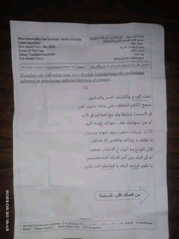 واقعة جامعة الإسكندرية، الإسكندري، ليست الأولى من نوعها، في العام الماضي، أثار امتحان مادة الترجمة من العربية إلى الإنجليزية، لطلاب الفرقة الثالثة بكلية الألسن في جامعة بني سويف، حالة من الجدل، بعد احتوائه على مجموعة من الأغاني.