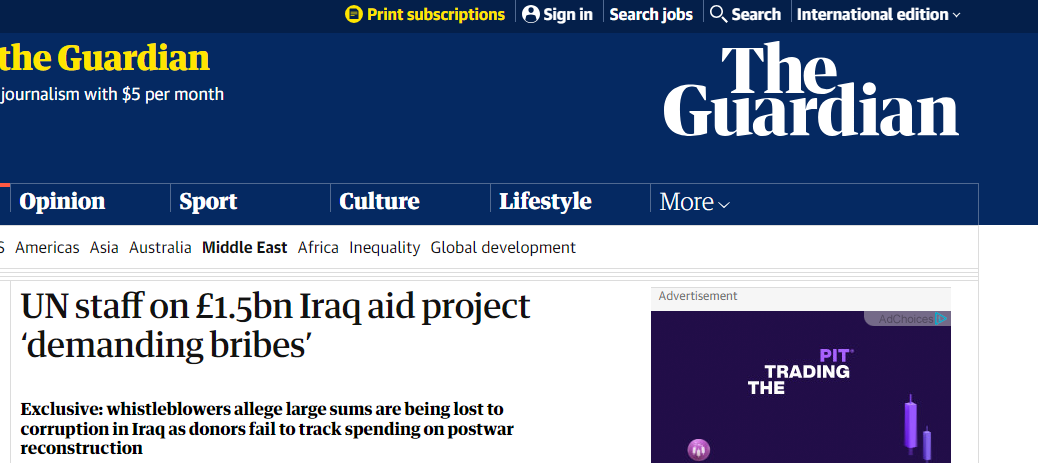 كشف تحقيق أجرته صحيفة The Guardian البريطانية أن موظفين عاملين بالأمم المتحدة في العراق طالبوا برشى مقابل مساعدة رجال أعمال في الفوز بعطاءات وعقود في مشروعات إعادة الإعمار بعد الحرب في البلاد إثر غزو قوات التحالف بقيادة أمريكا، وسقوط نظام الرئيس العراقي الراحل صدام حسين عام 2003.