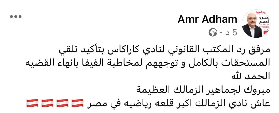 أعلن عمرو الأدهم عضو مجلس إدارة الزمالك عن انتهاء قضية كاراكاس وتسديد المستحقات بالكامل وإنهاء الأزمات التي كانت سبب في إيقاف القيد للقلعة البيضاء.