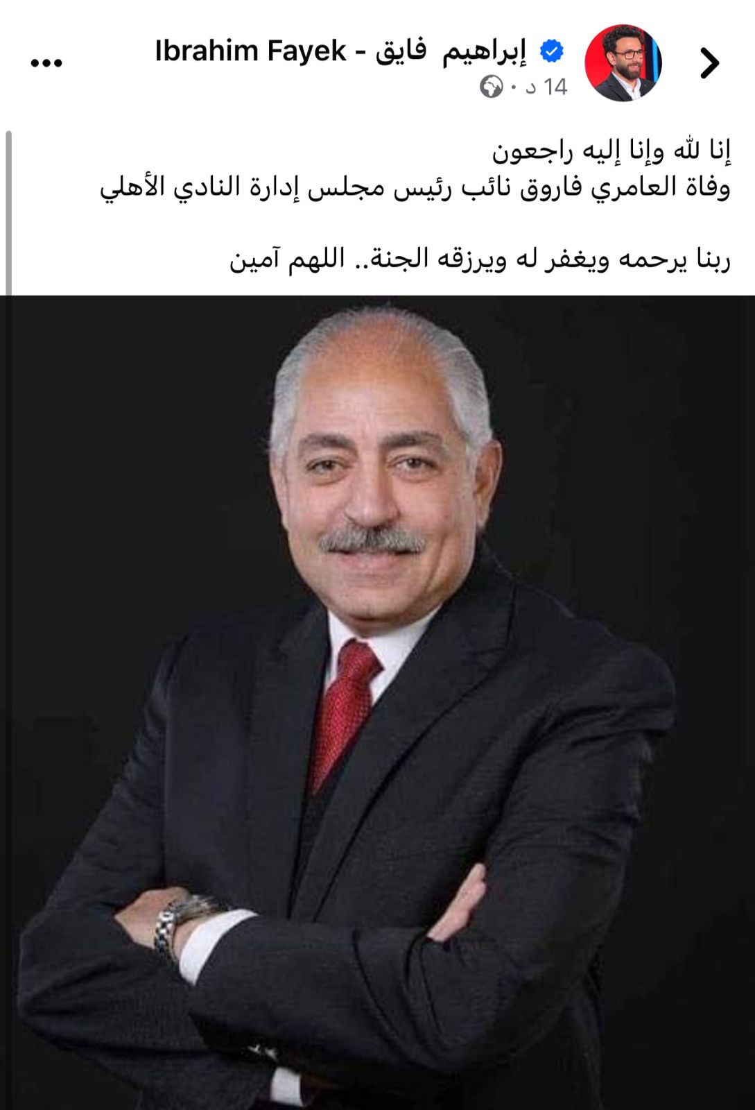 فيما أكدت مصادر أن العامري فاروق، فارق الحياة عصر اليوم الثلاثاء، وإدارة المستشفى قامت بإبلاغ محمود الخطيب رئيس النادي، الذي بدوره أبلغ الأهلي بالخبر.
