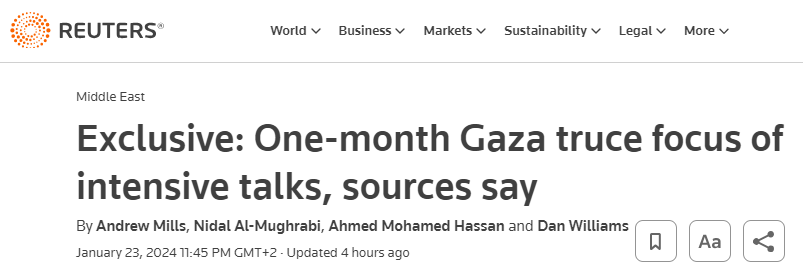 قالت ثلاثة مصادر لـ"رويترز"، أمس الثلاثاء ، إن إسرائيل وحركة حماس وافقتا بنسبة كبيرة من حيث المبدأ على إمكانية إجراء تبادل للأسرى الإسرائيليين بسجناء فلسطينيين خلال هدنة تستمر شهراً، وذكرت المصادر أن الخطة الإطارية تأخر طرحها بسبب وجود خلافات بين الجانبين بشأن كيفية التوصل إلى نهاية دائمة للحرب في غزة.