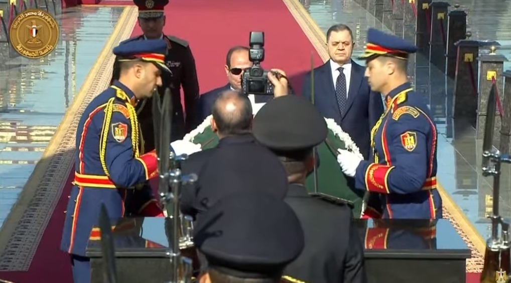 وضع الرئيس عبد الفتاح السيسي فور وصوله لأكاديمية الشرطة لحضور حفل عيد الشرطة، إكليلاً من الزهور على النصب التذكاري، حيث يقام الحفل بحضور وزير الداخلية وعدد من الوزراء والشخصيات العامة والرموز الوطنية وقيادات وزارة الداخلية.
