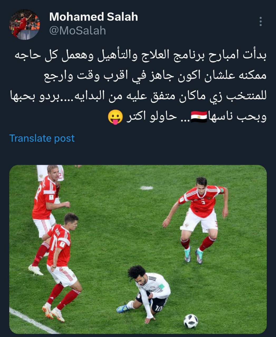 وقال محمد صلاح خلال تغريدة عبر منصة "X"، تويتر سابقًا:"هعمل كل حاجة ممكنة عشان أكون جاهز.. بردو بحبها وبحب ناسها".