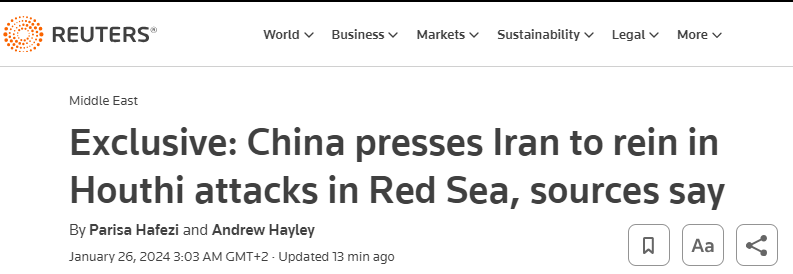 مسؤول إيراني مطلع على المحادثات كشف لوكالة رويترز أن الصين تقول إنه "إذا تضررت مصالحنا بأي شكل من الأشكال، فسيؤثر ذلك على أعمالنا مع طهران. لذلك اطلبوا من الحوثيين ضبط النفس".