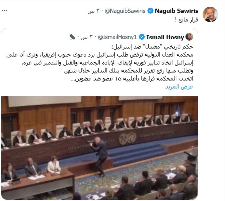 علق الملياردير المصري المهندس نجيب ساويرس، على قرارمحكمة العدل الدولية والخاص بتجريم إسرائيل، في حرب الإبادة الجماعية على غزة والعمل على حماية المدنيين، وقال في تغريدة على موقع التدوينات القصيرة، "أكس"، تويتر سابقًا: " قرار مايع!".