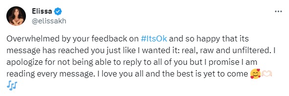 وكتبت إليسا عبر حسابه الشخصي على موقع التدوينات القصيرة “إكس”، تويتر سابقًا، جاء فيه:" سعيدة إن الرسالة وصلت زي ما كنت حابه، حقيقية ومن غير فلتر، أعتذر على عدم الرد على جميع الرسائل اللي وصلتني، ولكن أوعدكم إني هحاول اقرأ جميع الرسائل، والأفضل لم يأتي بعد".