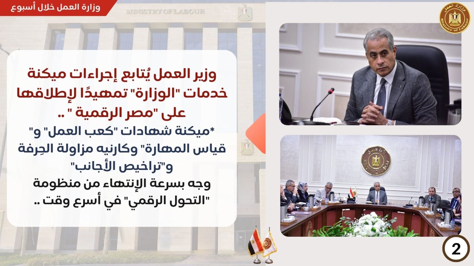 وتابع حسن شحاتة وزير العمل ،إجراءات تنفيذ خطة "الوزارة" نحو ميكنة الخدمات المُقدمة للمواطنين،وبشكل كامل ،تمهيدًا لإطلاقها على منظومة" مصر الرقمية "..ووجه الوزير خلال إجتماع إنعقد بديوان عام "الوزارة"،مع وفدِ من وزارة الاتصالات، و"شركة S3 " ،المُنفذة للمشروعات المشتركة بين"العمل"،و"الإتصالات"،ومُمثلي الإدارات المعنية بالتحول الرقمي داخل وزارة العمل،الإنتهاء من الإجراءات التنفيذية في أسرع وقت ،وطلب من الإدارات المُختصة إطلاعه وبشكل يومي ،بشأن تطورات عملية إنجاز بروتوكول التعاون بين "العمل" و"الإتصالات"،حول إطلاق المنظومات والخدمات الالكترونية في كافة مديريات العمل بالمحافظات،خاصة شهادات: القيد "كعب العمل"،و قياس مستوى المهارة ،وكارنيه مزاولة الحِرفة،وتراخيص عمل الأجانب.