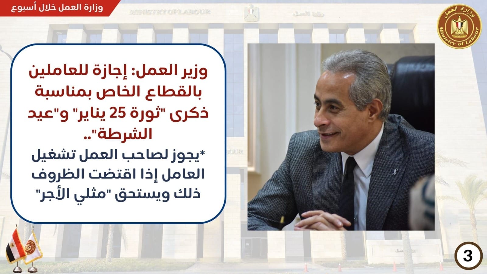 وأكد الوزير على أنه يجوز لصاحب العمل تشغيل العامل فى هذه الأيام أو بعضها، إذا اقتضت ظروف العمل ذلك، ويستحق العامل فى هذه الحالة، بالإضافة إلى أجره عن هذا اليوم مثلى هذا الأجر طبقا لنص المادة (52) من قانون العمل ..ووجه الوزير كافة مديريات العمل بالمحافظات بمتابعة تنفيذ القرار ..